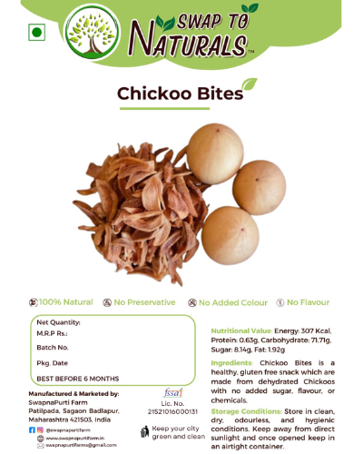 Dehydrated Chickoo Bites are healthy snacks that satisfies your sweet tooth. These delicious bites are made with 100% natural farm fresh chickoos, no added sugar, no preservative and colour. They are also gluten-free, vegan. Chickoo is an excellent source of Antioxidants, Vitamin A and C. They are perfect for on-the-go snacking. Chickoo Bites can be eaten as an energy booster between meals or during exercise to keep you going for longer. Shelf life – 6 months Store in a cool dry place away from sunlight in an airtight container.