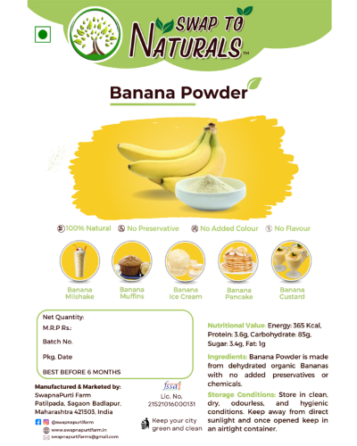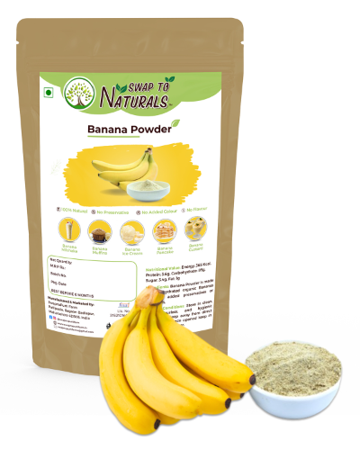 Banana is rich in fibre and has lots of health benefits like aiding in weight loss, reducing inflammation etc. Adding Swap To Naturals ready to use Banana Powder to your oatmeal can be great way to help turn this healthy breakfast into a healthier way to start the day. This powder can also be used in baby food, sweets, smoothies and milkshakes, protein shakes, pancakes, yogurt, muffins, cakes etc. Store in cool dry place away from sunlight in an airtight container. No Preservatives and added colour Shelf life: 6 months