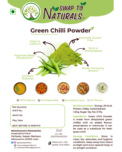 Green chilli powder is the result of drying fresh picked green chilli peppers and then grinding into a powder. Swap To Naturals green chilli powder is convenient to use and comes with no cutting and no wastage. It is widely used in soups, fast foods items, food preparations- vegetable and curries, Salad Dressing, Add to fritter batters(pakoras), Chaats etc. You can cook better and quicker using our dehydrated green chilli powder. Store in cool dry place away from sunlight in an airtight container. No Preservatives and No Colour Shelf Life- one year