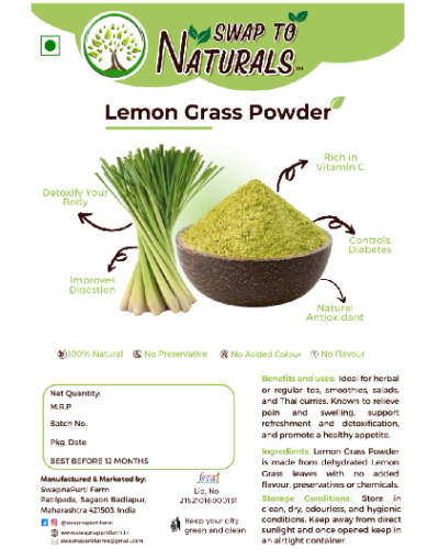 Dried or fresh lemongrass Powder is commonly used to make herbal teas and other drinks. One can use fresh lemon grass powder in curries, it is popular in many Asian cuisines and adds an intriguing flavour to soups and stews. Lemongrass is also used for making kadhas or home made cough syrups which reduces body pain, headache and increases sweating which helps to pacify high fever. Lemongrass supports healthy fat metabolism & promotes low fat deposition. Store in cool dry place away from sunlight in an airtight container. No Preservatives and No Colour. Shelf Life- one year. Take 1 teaspoons with warm water twice a day